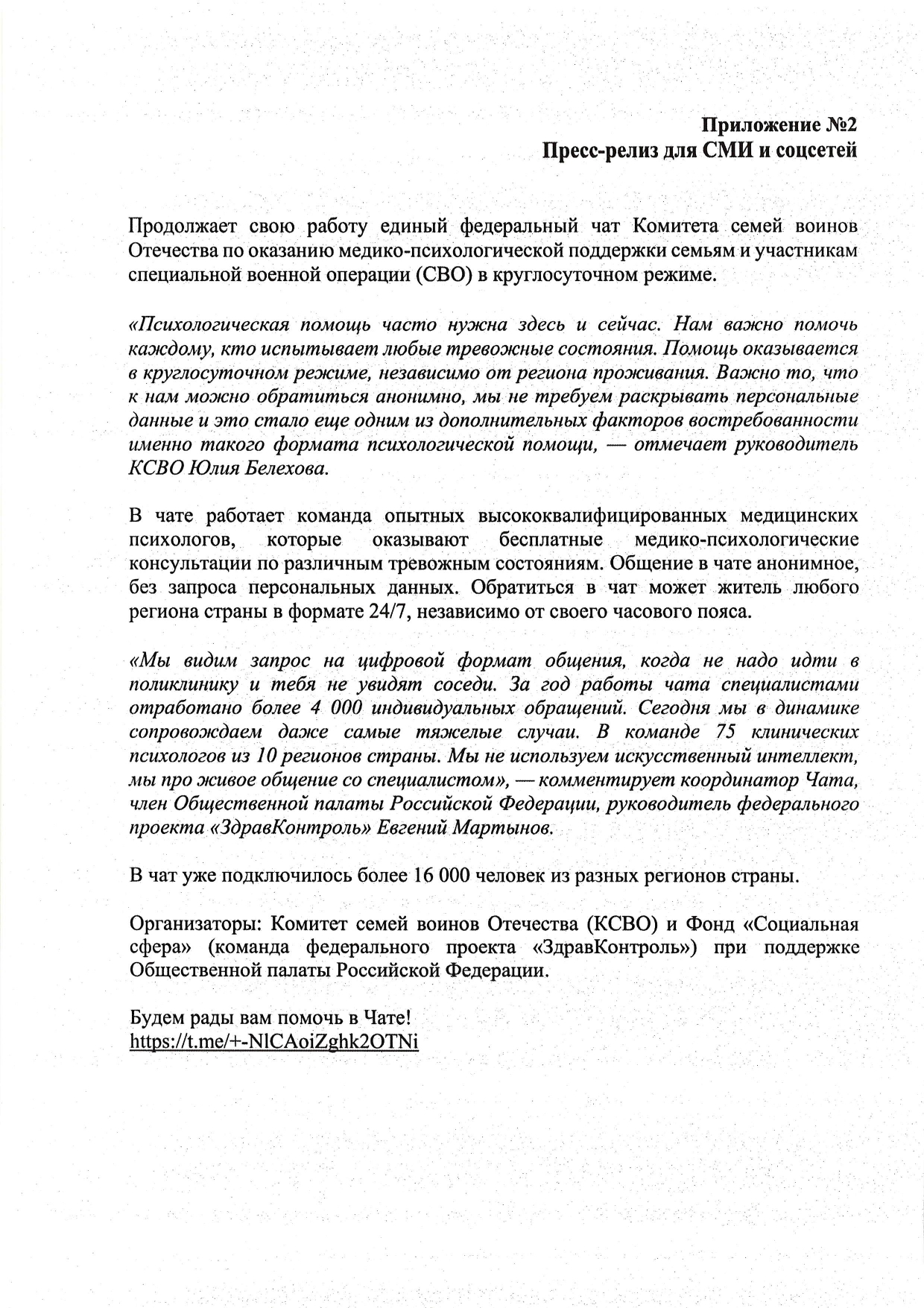 С июля 2024 года работает единый федеральный телеграм-чат медицинской психологической поддержки для семей воинов Отечества и участников СВО.
